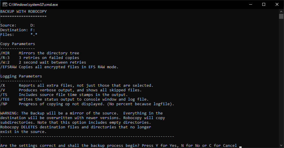 Next image robobackup first screen robocopy batch file execution screenshot 1 robocopy batch file execution screenshot 1: executing the robobackup script initially shows all used parameters